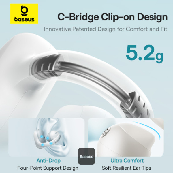 Baseus Bowie MC1 Open-Ear Ear Clip Headphones | Bluetooth 5.4 | 40H Battery | AI Bass | IP57 Waterproof - White
