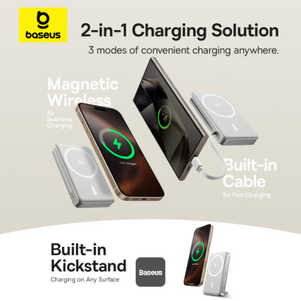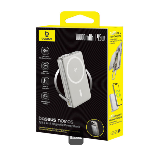 Baseus Nomos 3-in-1 10000mAh Power Bank - Qi2 Certified 15W Wireless Charger, 45W Built-In Two-Way Fast Charging Cable, Type-C Port, Kickstand - White