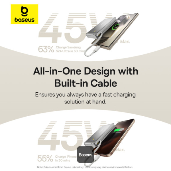 Built-in 45W USB-C Cable: No need to carry extra cables. The integrated two-way USB-C cable supports rapid 45W output and 30W input for versatile charging.