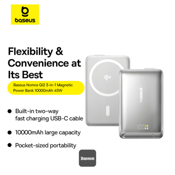Experience unmatched charging convenience with the Baseus Nomos Qi2 Power Bank, a 3-in-1 portable charger designed for your fast-paced lifestyle. Featuring a 10000mAh capacity, Qi2-certified 15W wireless charging, and 45W USB-C fast charging, this power bank ensures your devices are always ready, whether at home, the office, or on the go.